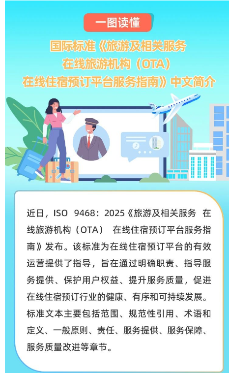 我國牽頭制定全球首個在線旅游機構(gòu)相關(guān)國際標準,以“中國方案”推動全球旅游服務(wù)標準化進程。近日,我國牽頭制定的《旅游及相關(guān)服務(wù)在線旅游機構(gòu)(OTA)在線住宿預(yù)訂平臺服務(wù)指南》(ISO9468:2025)國際標準正式發(fā)布。這是全球首個在線旅游機構(gòu)相關(guān)國際標準,旨在規(guī)范全球在線住宿預(yù)訂平臺及其服務(wù),破解“大數(shù)據(jù)殺熟”“捆綁消費”“退改難”等痛點,構(gòu)建公平透明的消費生態(tài)?!吨改稀访鞔_了平臺方和住宿服務(wù)提供商的責任,規(guī)范了訂購、支付、退改、評價等環(huán)節(jié)的服務(wù)條款,提出了信息安全、財務(wù)安全和隱私保護等方面的服務(wù)保障要求。其發(fā)布是中國參與全球標準化工作的生動實踐,將推動全球旅游服務(wù)在標準化軌道上實現(xiàn)高質(zhì)量發(fā)展。